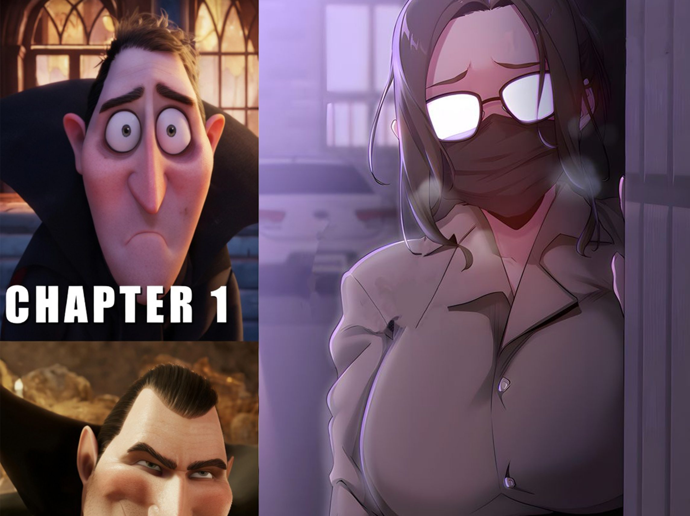 The atmosphere is tense and secretive, as she is shown peeking from behind a wall or corner, looking toward the viewer. The purple and cool-toned lighting, combined with the visible breath or steam in the air, adds to the nighttime aesthetic. As with your previous examples, the inclusion of the “Chapter 1 vs. Chapter 3” meme suggests that this character undergoes a dramatic transformation or is involved in a plot that intensifies significantly as the story unfolds.