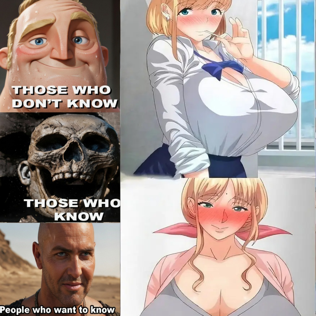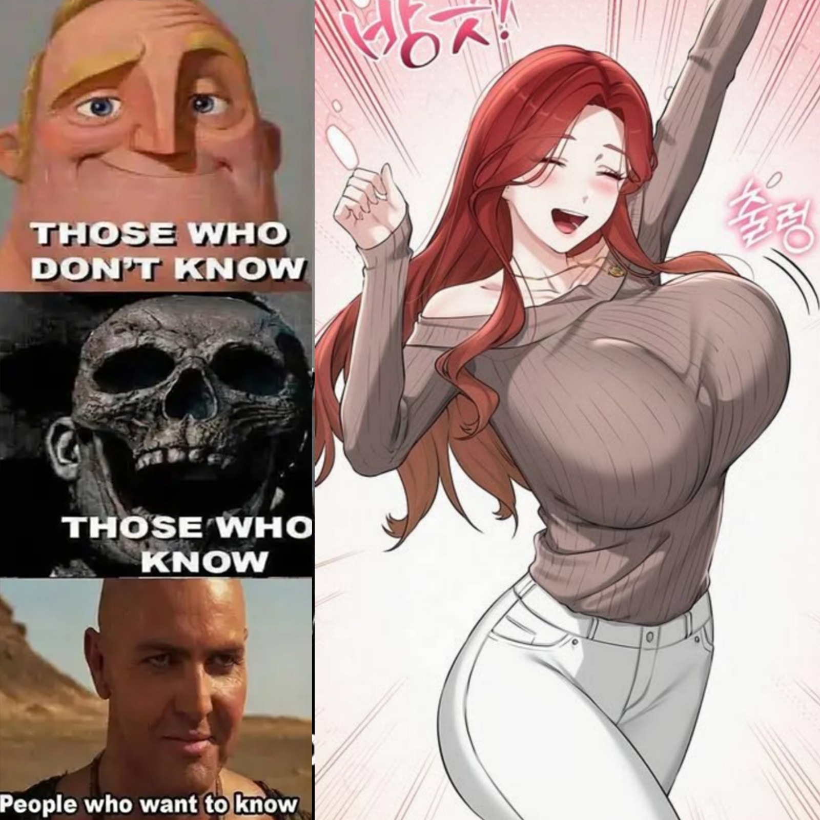 A composite image is presented, featuring a three-tier meme structure on the left side and a panel from an illustrated series on the right. The top left features an illustration of a smiling man with the caption “THOSE WHO DON’T KNOW.” The middle left shows a close-up of a skull structure with the caption “THOSE WHO KNOW.”