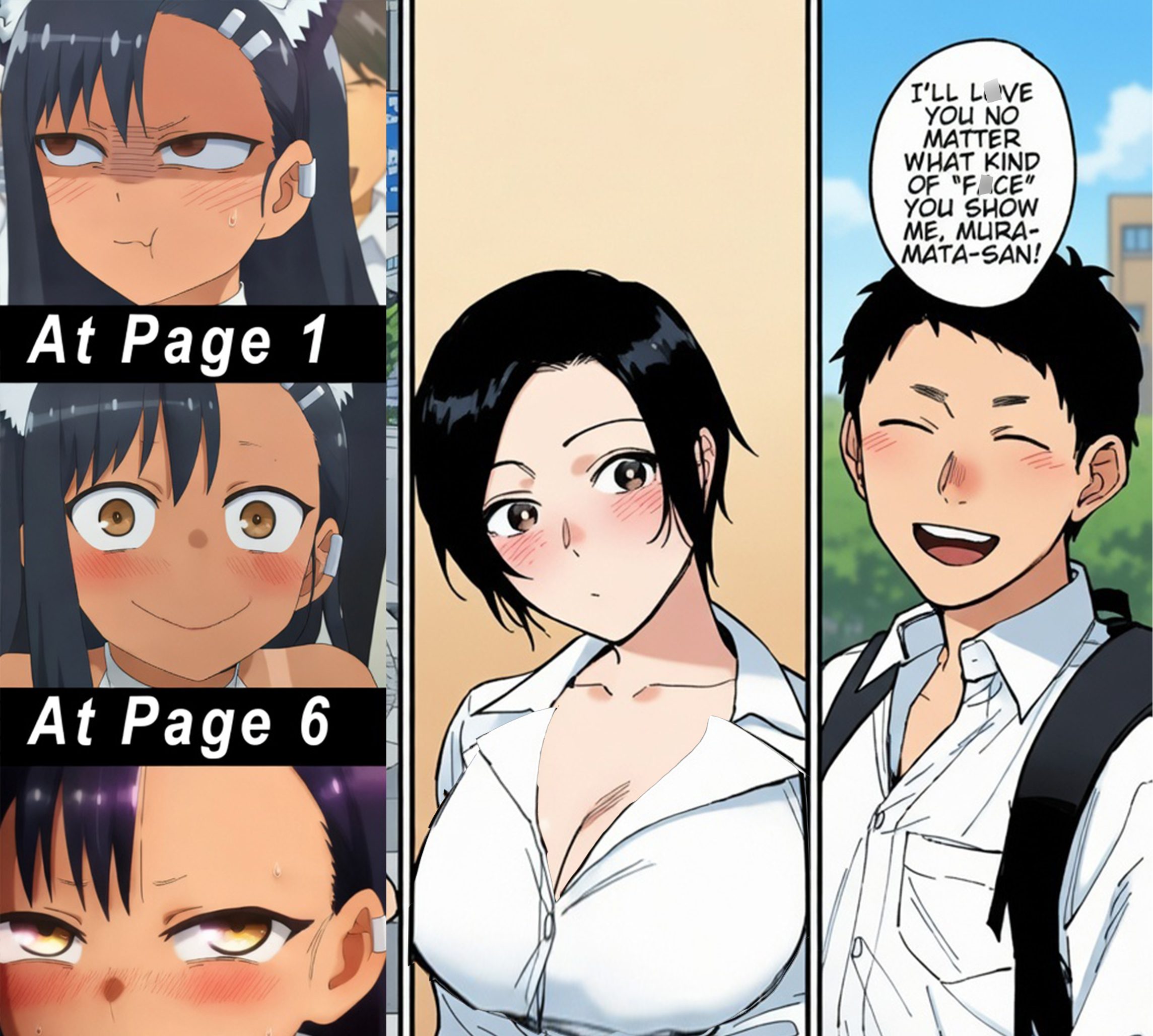 The primary theme here is acceptance and emotional connection. By placing Nagatoro’s famously eccentric expressions next to the man’s declaration of love, the collage suggests a story where a partner embraces all sides of a person’s personality—even the silly, moody, or intense parts. It captures a “wholesome” moment of reassurance within a relationship.