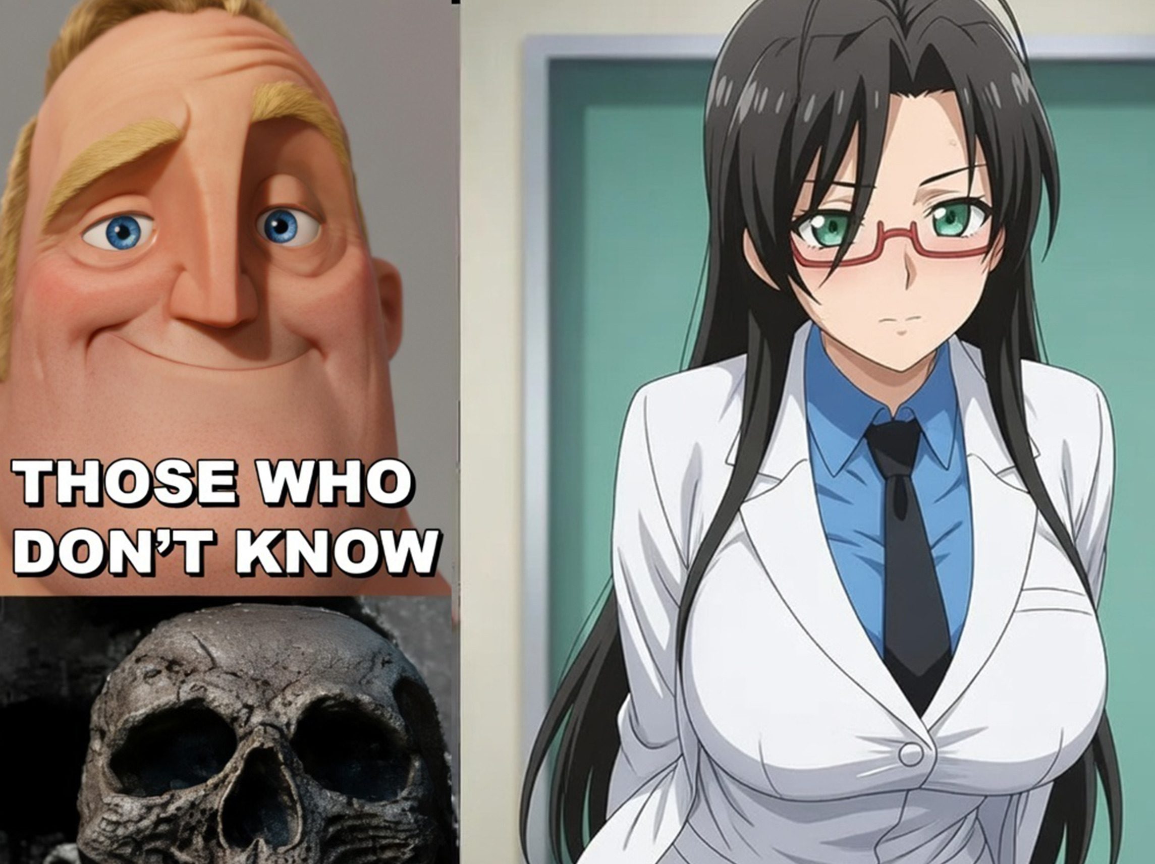 A composite image is shown, containing four distinct panels arranged in a grid-like manner. The three panels on the left form a vertical stack. The top-left panel is a close-up photograph of a smiling, stylized Mr. Incredible character from an animated film, with text below him that says, Those who don’t know. The middle-left panel contains a photograph of a real human skull with its mouth wide open, looking quite startled or dramatic,