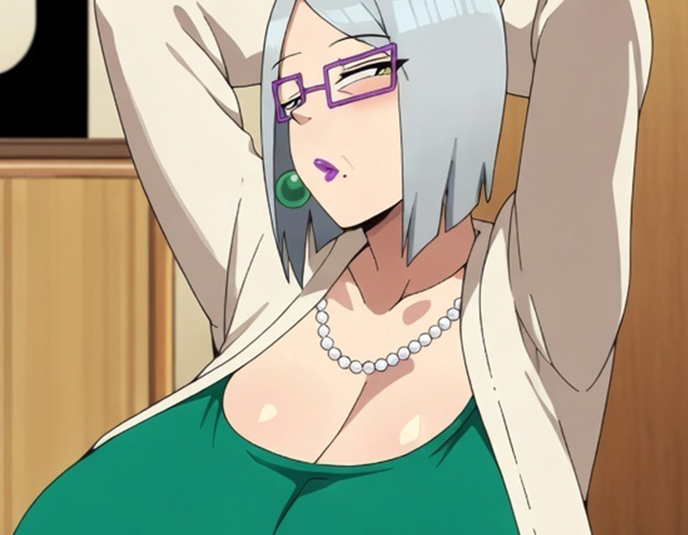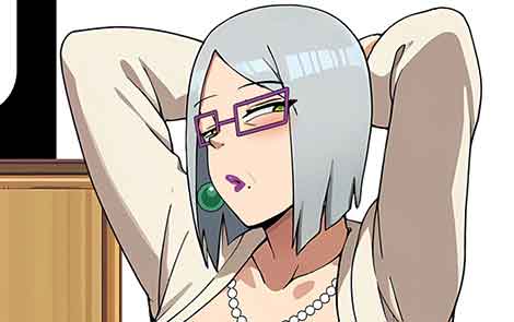The right side of the image features a different anime-style character with short silver hair and purple-rimmed glasses. She is wearing a green dress and a white cardigan, posing with her arms behind her head. The juxtaposition of these images implies that Nagatoro’s reaction is shifting as she observes or interacts with this character over time.