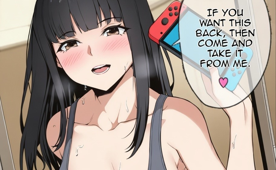 he image is a humorous meme that subverts expectations by using a classic movie quote to respond to a provocative situation. The top panel shows an anime character holding a game console and using flirtatious language to challenge someone to take it back from her, implying a romantic or suggestive encounter.
