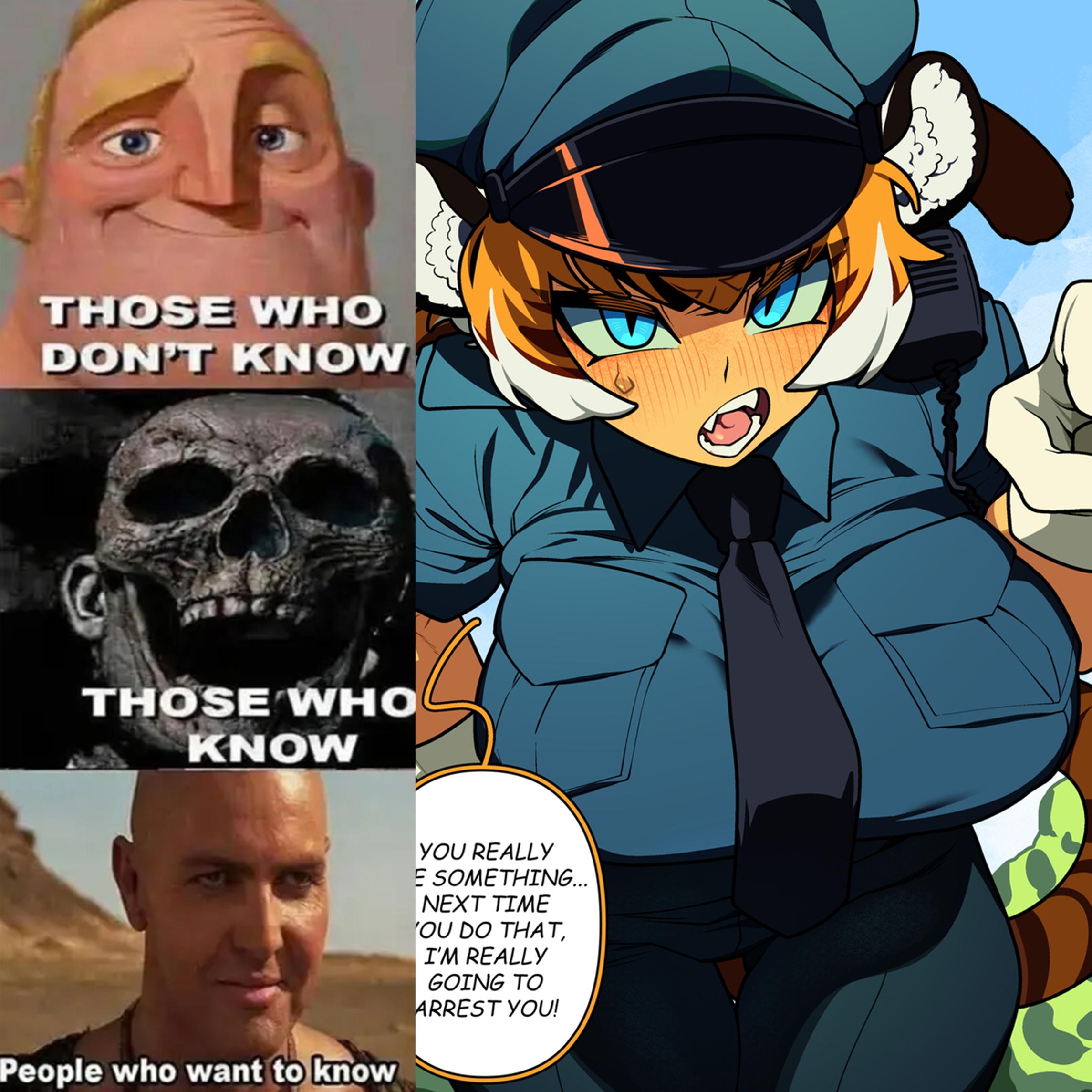 A three-panel image macro is on the left, with the right side showing an anime-style digital painting of a woman. On the top left panel, Mr. Incredible from The Incredibles is shown smiling above white, sans-serif text that reads “THOSE WHO DON’T KNOW”. In the middle, a human skull with large eye
