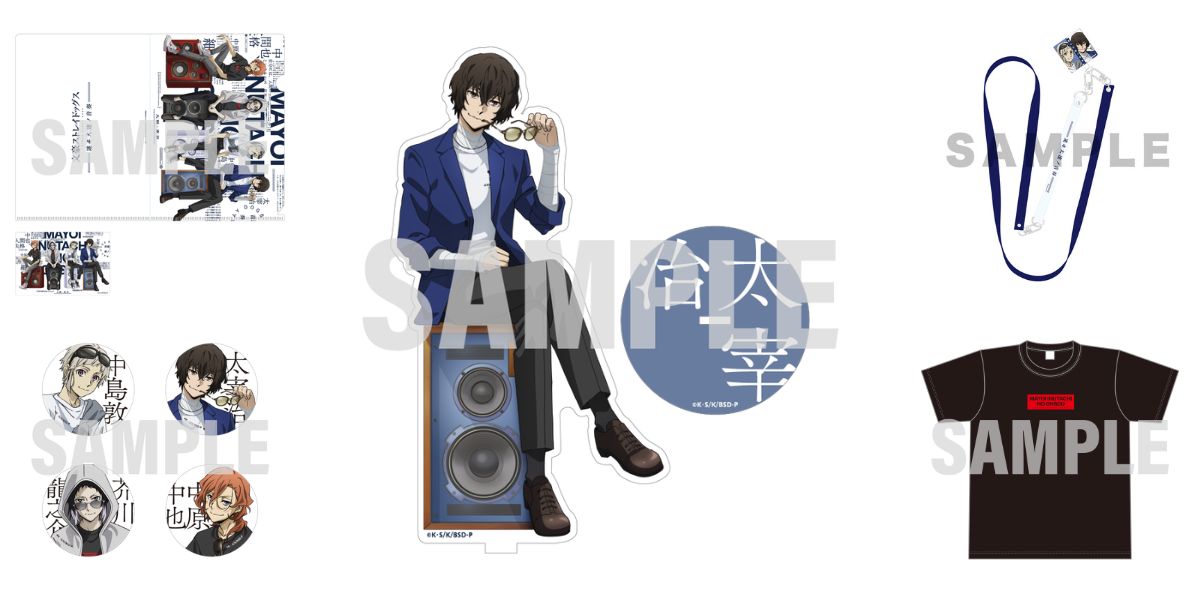 Acrylic stands representing key characters such as Atsushi Nakajima, Osamu Dazai, Ryunosuke Akutagawa, and Chuya Nakahara are also available, each priced at JPY 2,200. Additional goods include an A5 clear file and sticker set, along with randomly distributed can badges featuring four character designs.