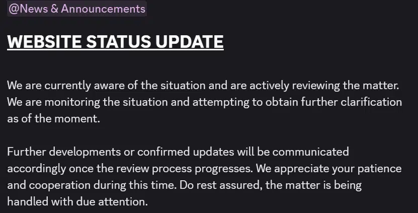 “We are currently aware of the situation and are actively reviewing the matter. We are monitoring the situation and attempting to obtain further clarification as of the moment. Further developments or confirmed updates will be communicated accordingly. We appreciate your patience and do rest assured, the matter is being handled with due attention.”