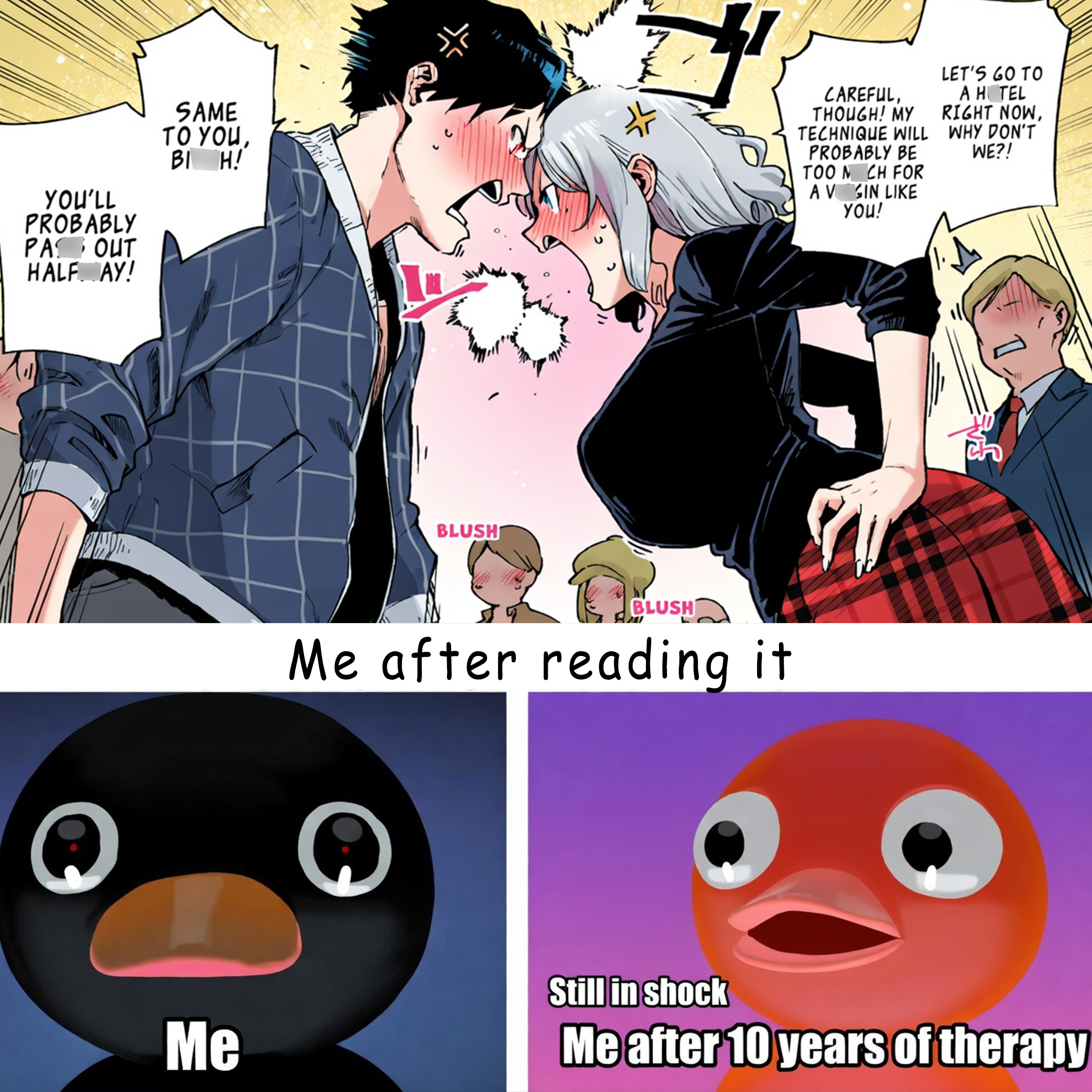 In this vibrant manga scene, two main characters are caught in a very loud and energetic disagreement in the middle of a busy street. Both characters have bright red faces, showing they are feeling a mix of embarrassment and frustration as they shout at one another. Their intense expressions and the “angr symbol” icons above their heads suggest a classic comedic rivalry. Around them, several bystanders are watching the spectacle with awkward blushes, clearly surprised by how much noise the pair is making in public.