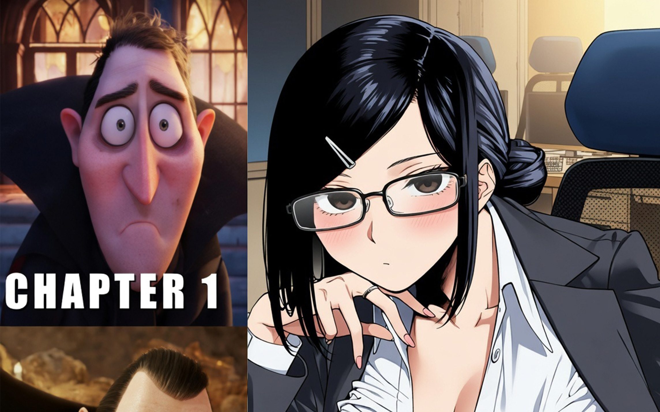 She is shown sitting at a desk with a mechanical keyboard, leaning slightly forward with a thoughtful, somewhat intense expression and a faint blush on her cheeks. Her gaze is directed steadily toward the viewer, and she has one hand raised toward her face in a contemplative gesture. Similar to the previous images, this character is paired with the “Chapter 1 vs. Chapter 3” Dracula meme, implying a significant shift in her character arc or the intensity of the story as it progresses.