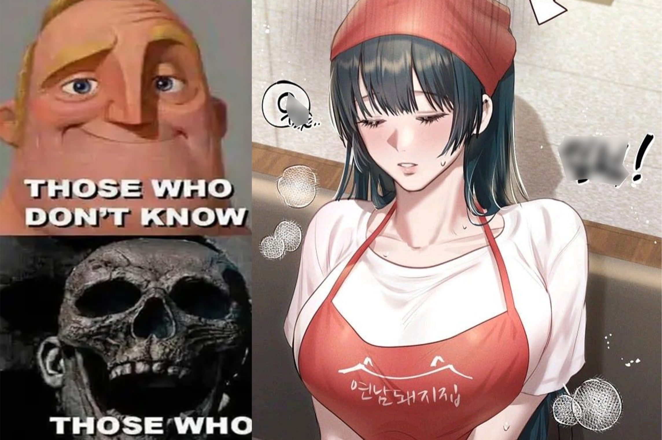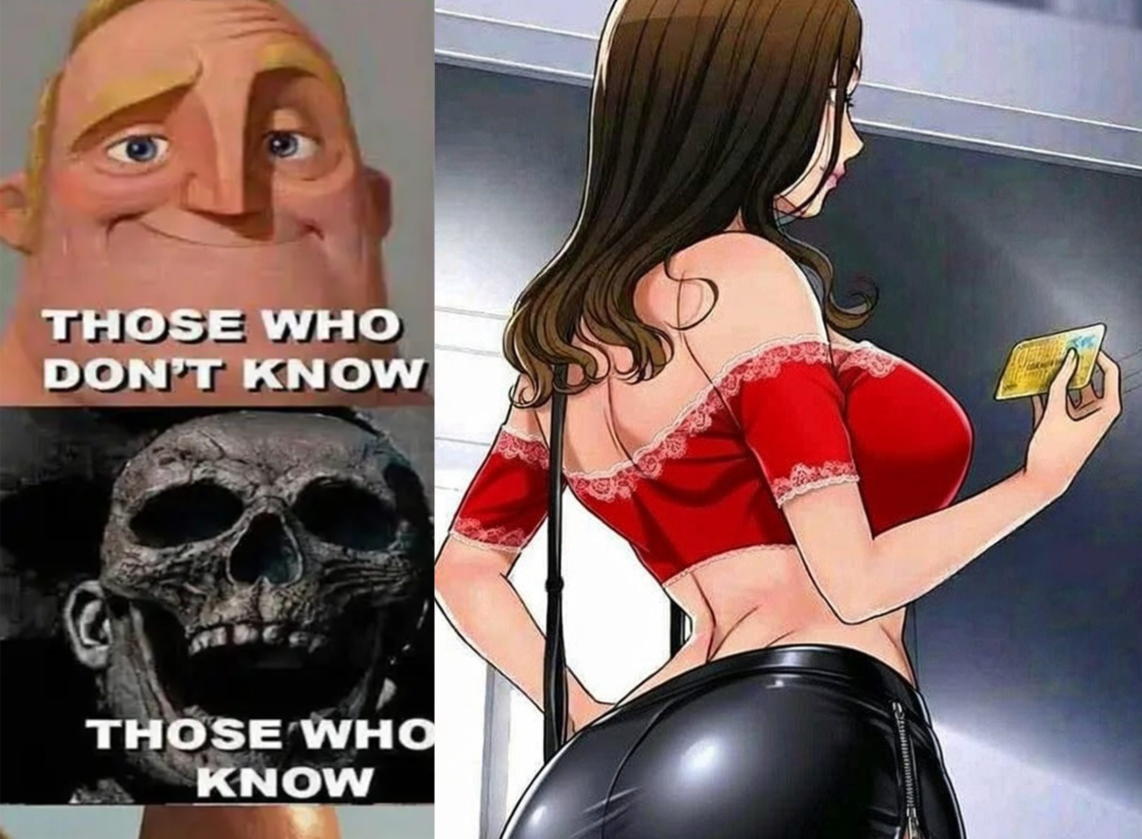 This image is a composite of a multi-panel meme on the left and a manga panel on the right. The left column uses various images of faces to depict different levels of knowledge or curiosity regarding the subject on the right. The topmost panel shows a smiling Mr. Incredible with the caption “Those who don’t know,” followed by a skull with an wide grin captioned “Those who know.” Below these, the panel features the actor Arnold Vosloo as Imhotep from The Mummy, with the