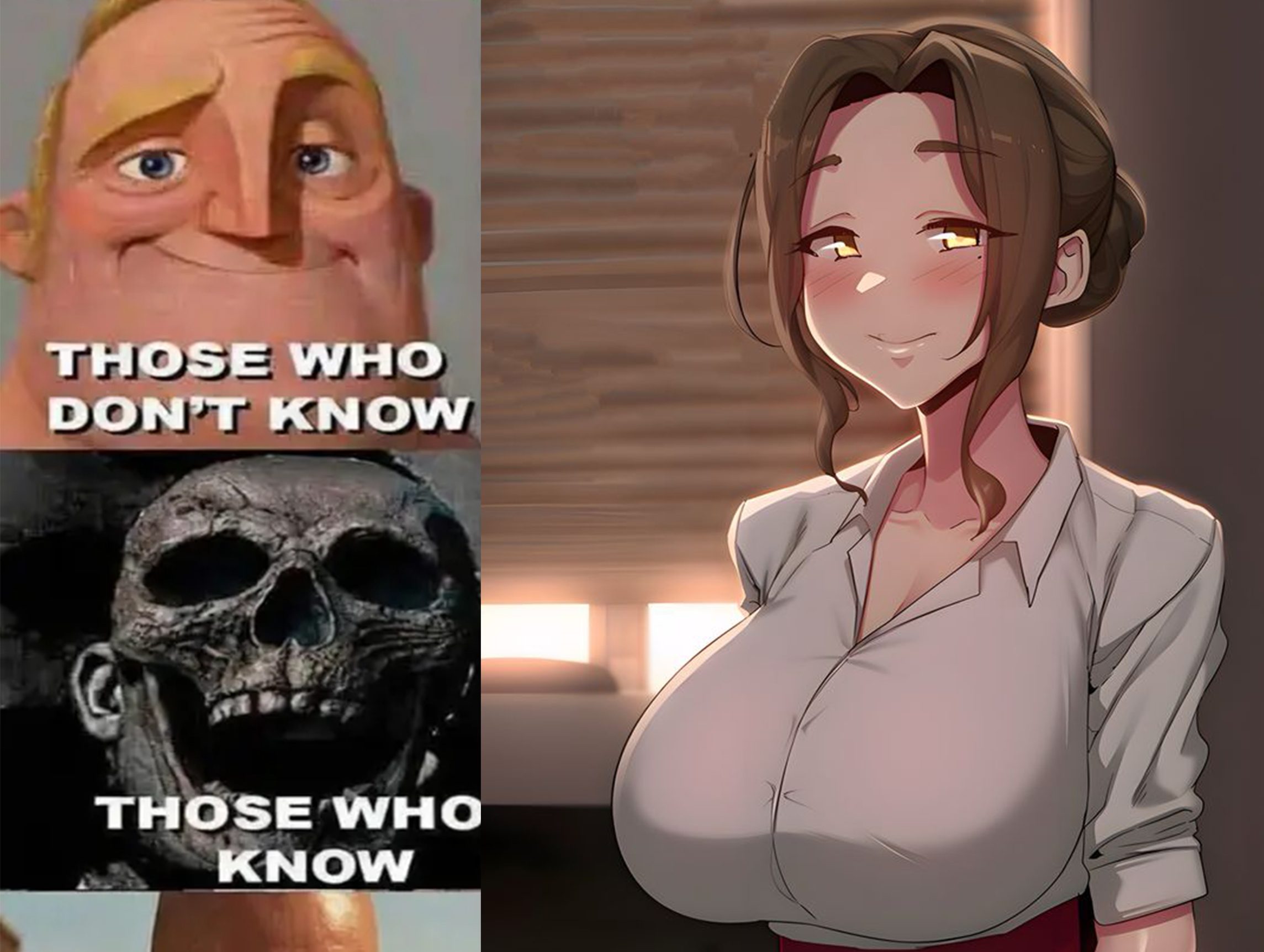 She is shown standing in a dimly lit room with light filtering through window blinds in the background, creating a soft, atmospheric glow. Her posture is poised, with her hands behind her back, giving her a welcoming and mature appearance. As with the previous memes, her character is placed alongside the “Those Who Know” template, implying she is a recognizable figure from a specific series where her kind demeanor might be part of a more complex or famous narrative context.