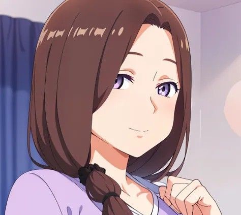 This image features a woman illustrated in a modern anime style, characterized by a soft and gentle demeanor. She has long, dark brown hair with a small section tied into a side ponytail using a dark scrunchie,