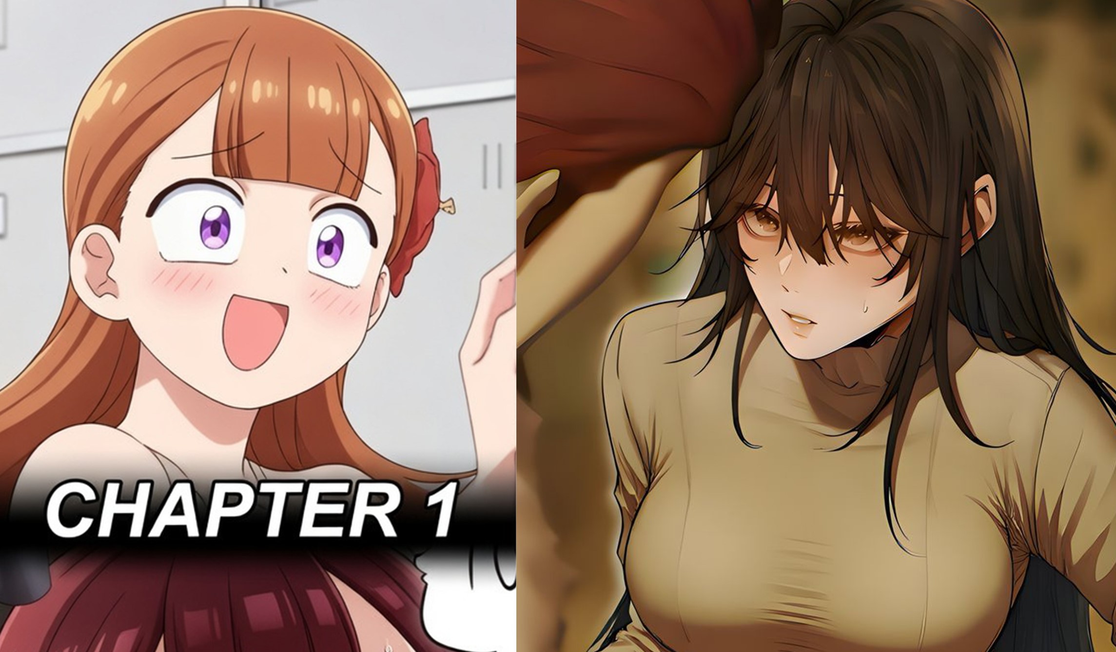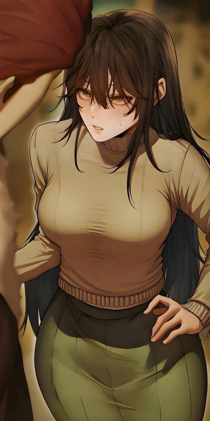 This digital illustration features a young woman with long, dark brown hair and warm, amber-colored eyes. She is depicted with a slight blush on her cheeks and a focused, somewhat intense expression as she looks slightly downward. Her outfit consists of a light tan or beige turtleneck sweater tucked into olive-green trousers, accented by a simple black belt.