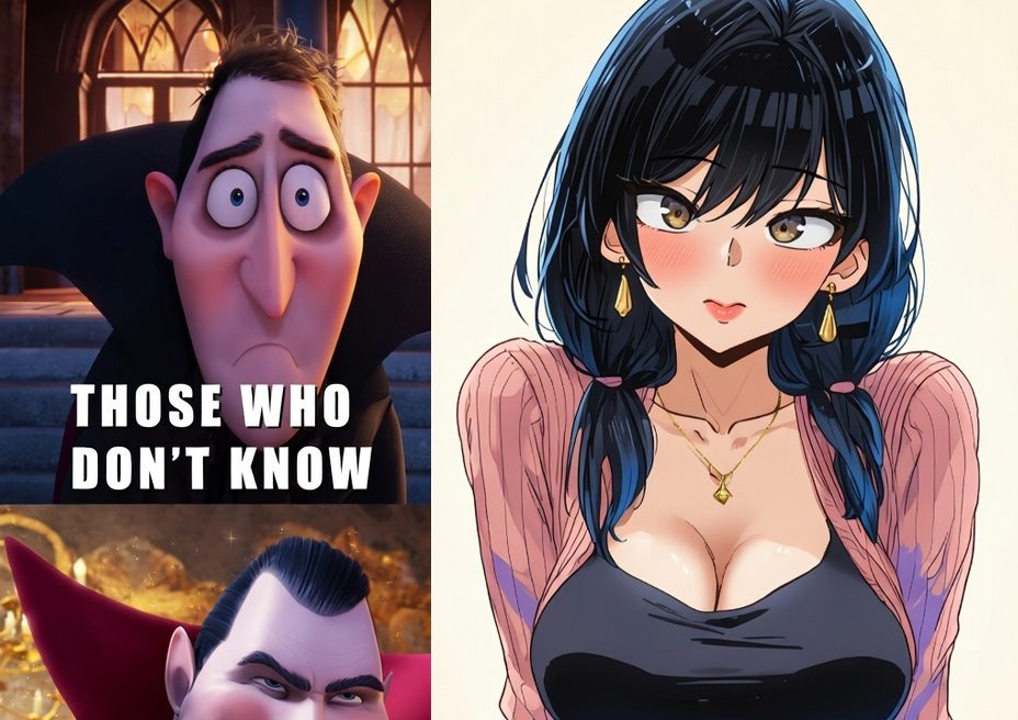 On the right side is a detailed anime-style illustration of a young woman with long dark hair tied in twin tails, wearing a form-fitting black dress under a loose open cardigan, accessorized with dangling earrings and a delicate necklace. She has a soft, knowing expression with flushed cheeks and half-lidded eyes. The contrast between the cartoon vampire’s dramatic mood shift and the calm, self-assured anime character creates the joke, implying that people “in the know” recognize and appreciate something special or particular about the illustrated woman.