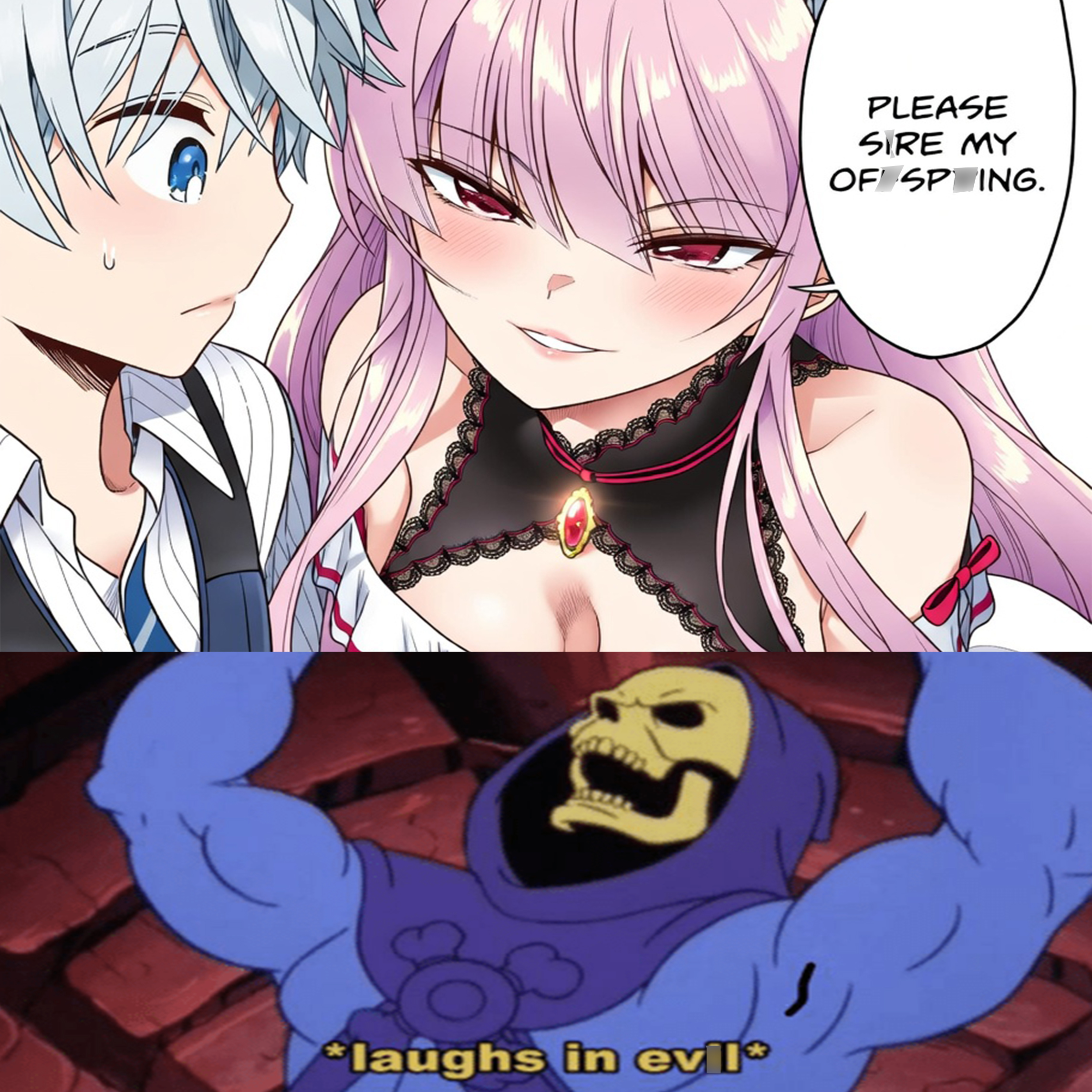 - Dialogue: The text in the speech bubble reads “PLEASE SIRE MY OFF*PRING.”